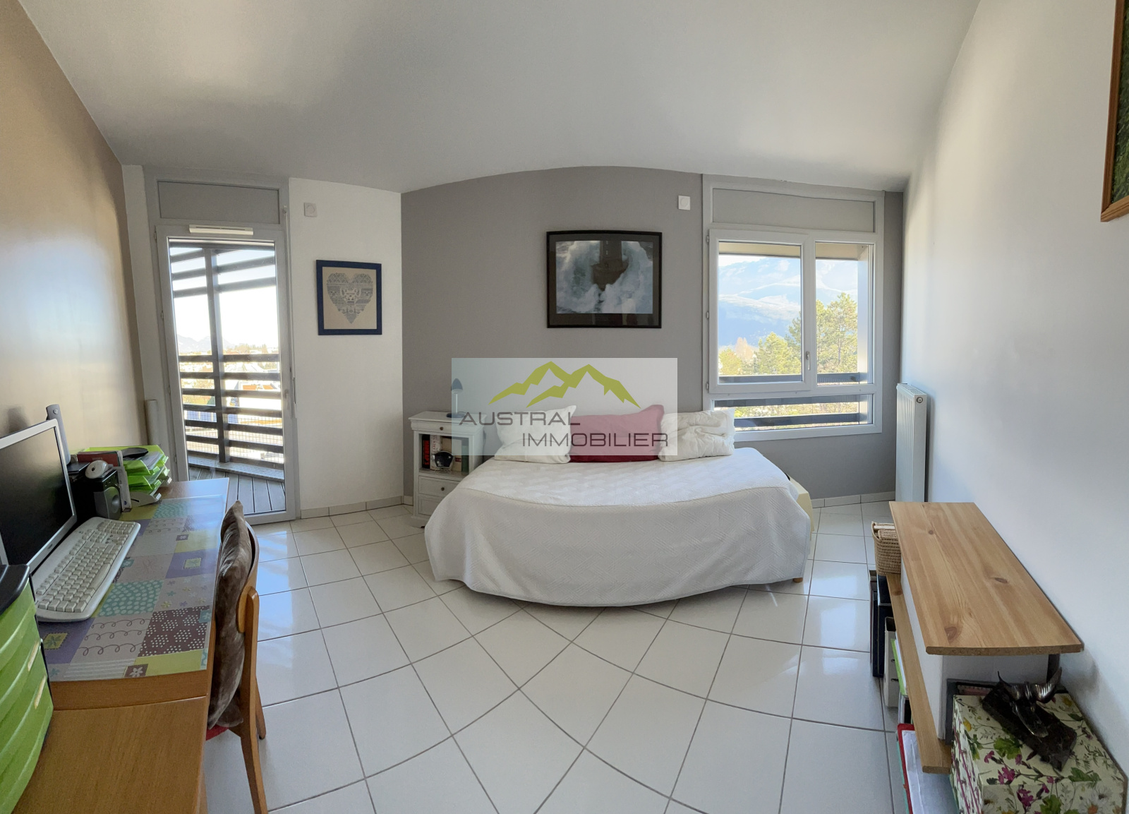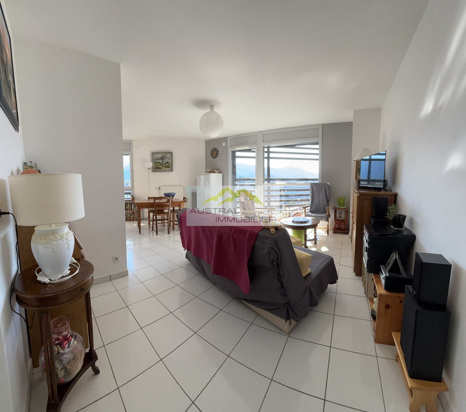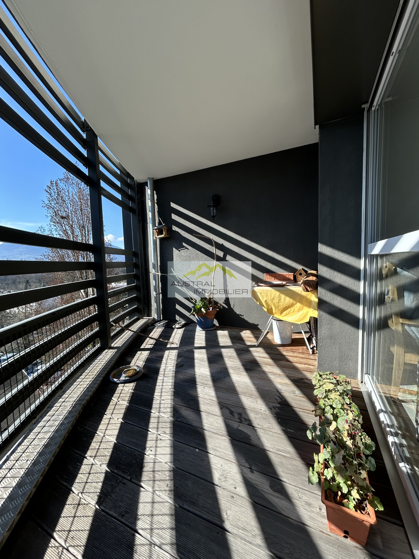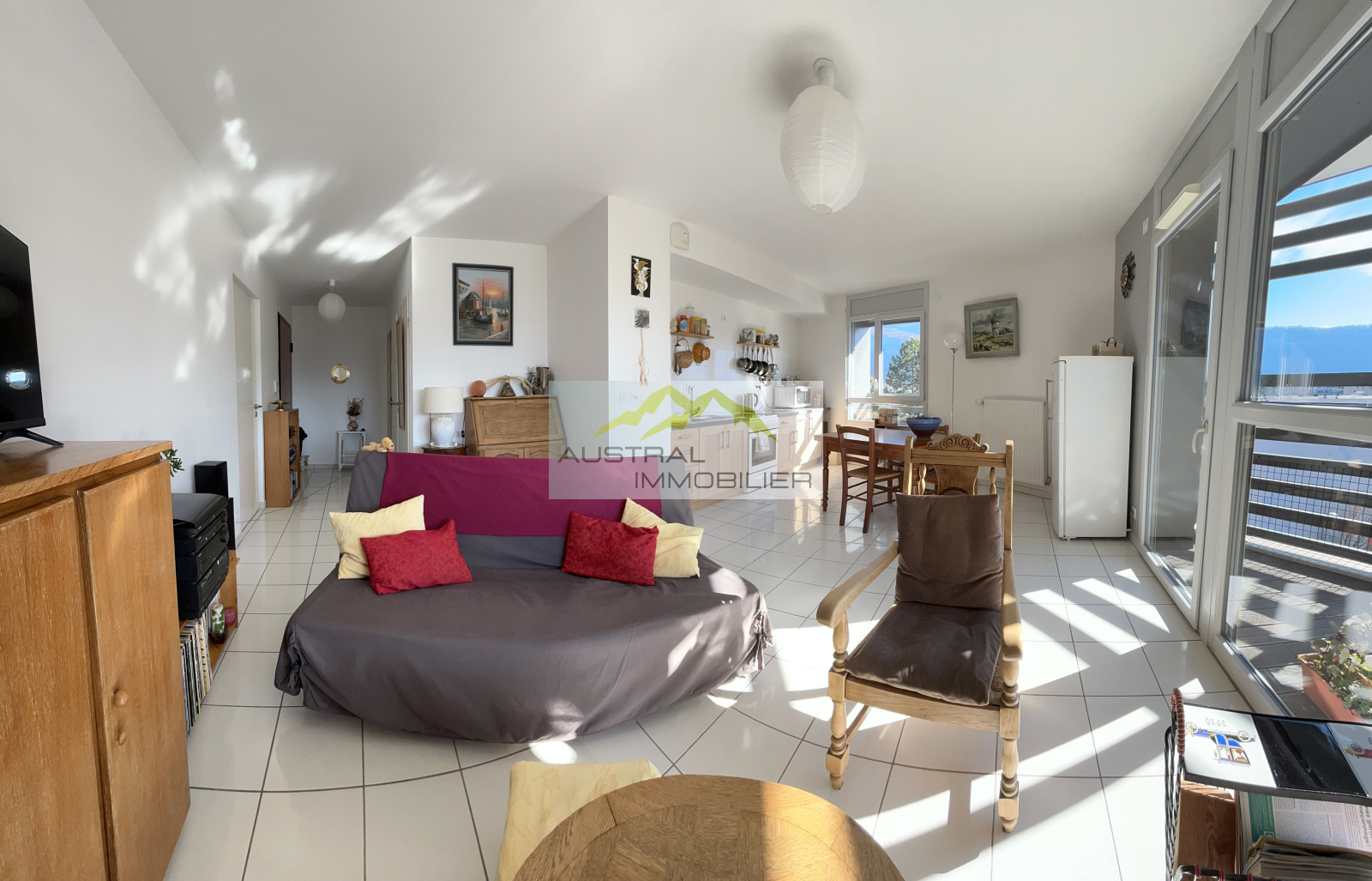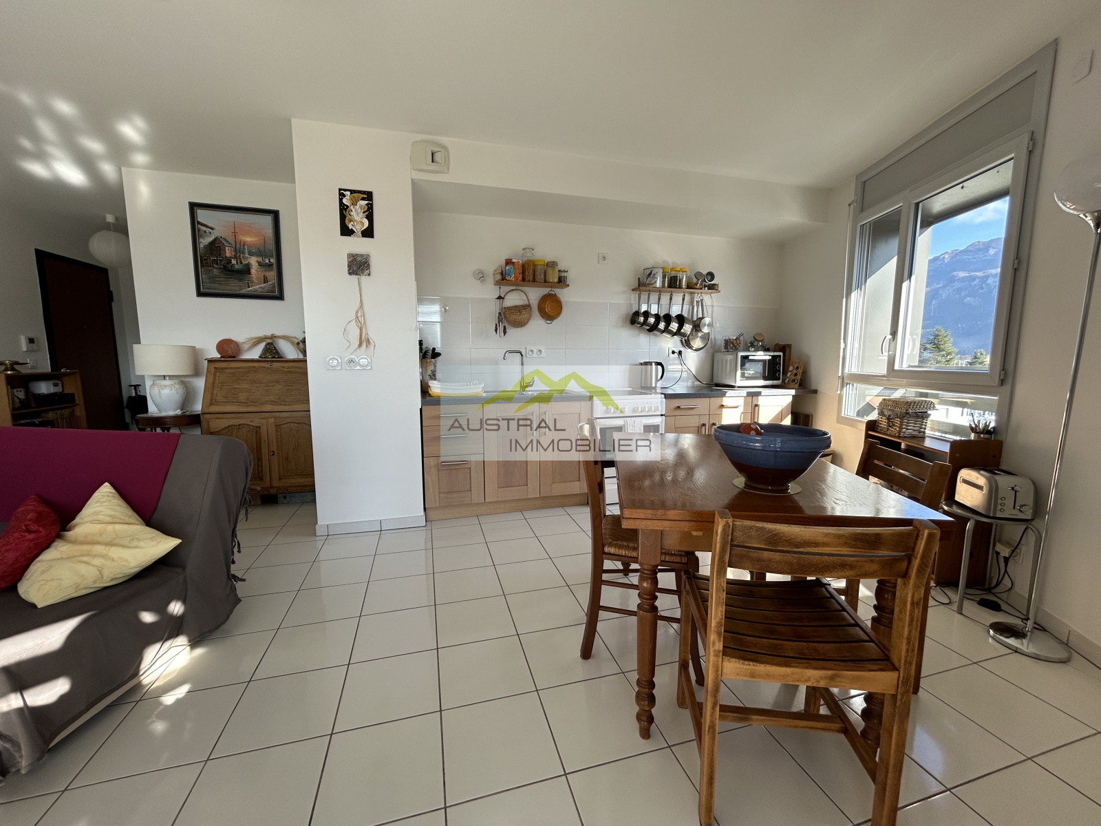 Le hall d'entrée comprenant un dégagement avec placard donne accès à un lumineux séjour/cuisine de 30 m². Depuis cette pièce de vie, on accède à un spacieux balcon orienté Sud d'environ 8 m², permettant d'agrandir la pièce de vie à la belle saison et de déjeuner en admirant les montagnes environnantes.